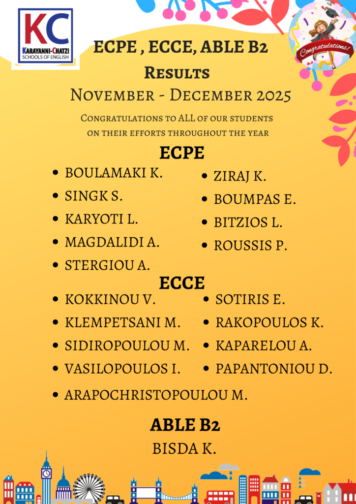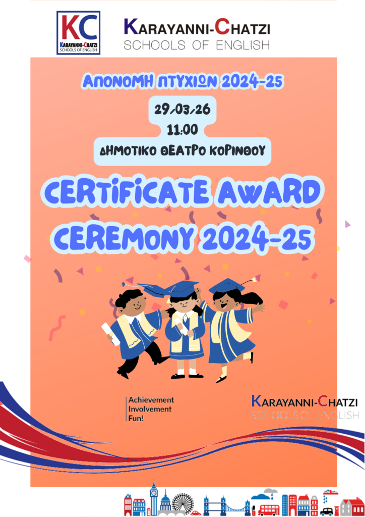 Πρόσκληση Έχουμε την τιμή να σας προσκαλέσουμε στην απονομή των πτυχίων γλωσσομάθειας των μαθητών του Κέντρου Ξένων Γλωσσών Καραγιάννη – Χατζή που θα πραγματοποιηθεί την Κυριακή 29/3/2025 στις 11:00 στο Δημοτικό Θέατρο Κορίνθου ‘Θωμάς Θωμαίδης’, Δαμασκηνού 57, 20131, Κόρινθος.